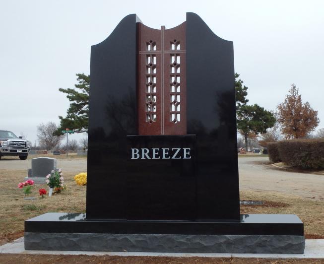 This estate memorial was created using polished black granite set on a black granite base that is polished at the top and rough cut at the bottom. It features a red granite cross centerpiece with decorative cut-outs around the cross. The general shape and cut-outs of the centerpiece are based on a decorative bronze gate that Mrs Breeze liked. One side of the monument only contains the name Breeze in large block letters. The other side of the monument also has the name Breeze. This side has 3 laser etched pictures and the following information; Odell & LoReta, Married March 7, 1949, Parents of Randy, Rocky, Robin and Rodney. This estate memorial is located in the Highland Cemetery in Lawton.