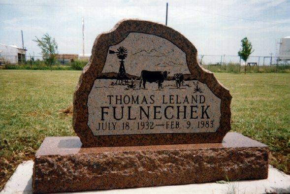 The Oklahoma Red Granite freeform monument depicts a southwest Oklahoma farm scene. The design and lettering are all sand engraved.