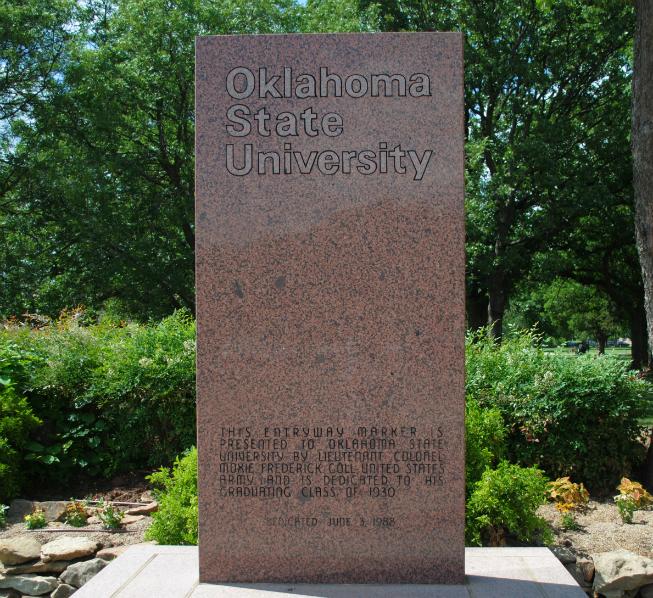 This red granite sign is located by the campus firehouse at Oklahoma State University in Stillwater, OK.